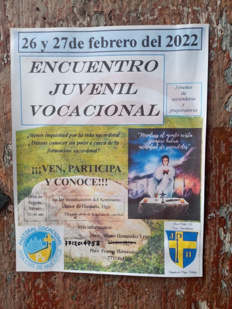El Encuentro juvenil sacerdotal que es organizado por la Diócesis de Huejutla de Reyes se llevará a cabo a partir de las 10:00 horas del 26 de febrero, en las instalaciones del Seminario Menor ubicado en los anexos de la parroquia de El Sagrario Catedral, en esta ciudad de Huejutla de Reyes.
