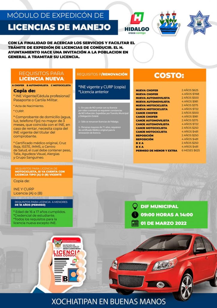 Xochiatipan, Hgo. – Con el propósito de acercar el servicio de expedición de licencias de manejo, el ayuntamiento a través de Seguridad Pública y Tránsito Municipal, invita a la población a realizar dicho trámite, y que quienes aún no cuentan con el documento oficial lo obtengan sin necesidad de trasladarse a otro municipio.