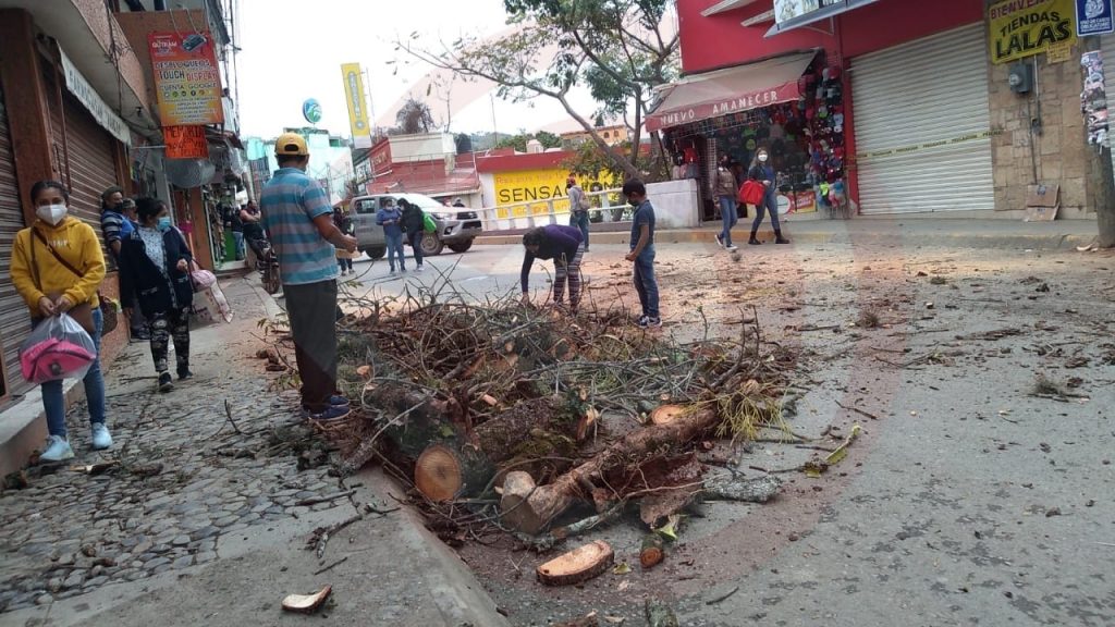 Huejutla, Hgo. – Personal adscrito a la dependencia municipal de Protección Civil, con el apoyo de empleados de la Comisión Federal de Electricidad (CFE), podó las gruesas ramas de la ceiba que se ubica en la avenida Nuevo León, de la colonia Santa Irene.