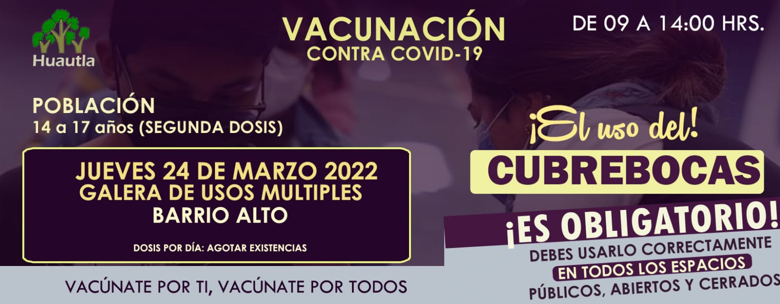 Huautla, Hgo. – La secretaría General del gobierno local en coordinación con el área de Salud municipal, convoca a los jóvenes de 14 a 27 años a la aplicación de la segunda dosis de la vacuna ANTI-COVID-19 este 24 del mes y año en curso.