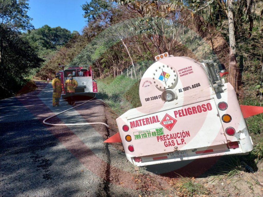 Chalma,Ver.- Fuerte movilización de rescatistas del departamento de bomberos causó un accidente carretero, donde una pipa gasera estuvo a punto de volcar por una falla mecánica.