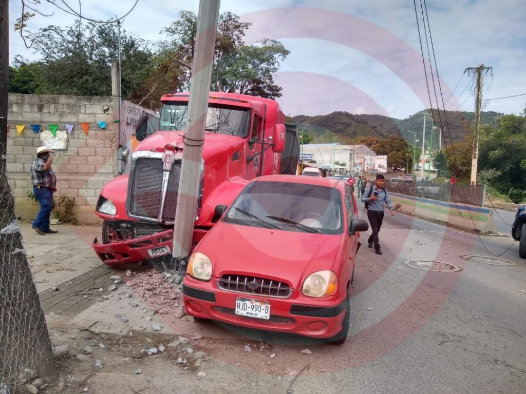 Huejutla, Hgo. – Brutal accidente estuvo a punto de terminar en tragedia, luego de que un tráiler se impactara con un vehículo particular, una camioneta pasajera y posteriormente contra un poste de energía eléctrica, ya que presuntamente presentó una falla mecánica.