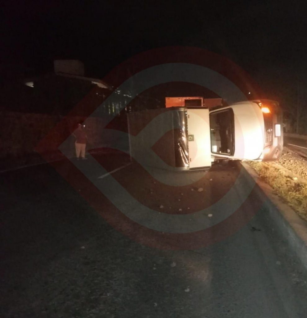 Al arribar al sitio localizaron la unidad recostada en la cinta asfáltica, la cual resultó con cuantiosos daños materiales, así mismo, afortunadamente no se reportaron personas lesionadas, por lo que el vehículo minutos más tarde fue trasladado al corralón, de igual manera, se presume que el tripulante perdió el control de la camioneta, lo que causó que terminara volcada.