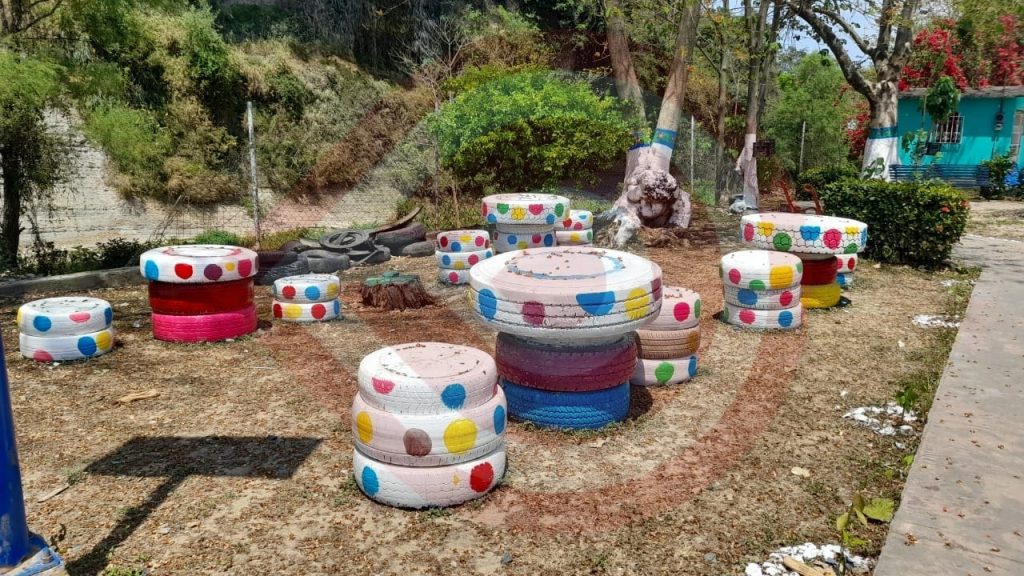 Es oportuno destacar, que los alumnos de la UPN quienes coadyuvaron en el propósito agudizado su ingenio, habilitaron un sector con sillas y mesas utilizando llantas viejas, lo que le otorga un aspecto singular y atractivo.