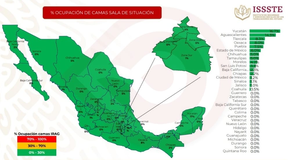 Las entidades con ocupación hospitalaria son: Yucatán, 16.7 por ciento; Aguascalientes, 14.3 por ciento; Tlaxcala, 8.3 por ciento; Oaxaca, 8 por ciento; Puebla, 7.5 por ciento; Estado de México, seis por ciento; Chihuahua, cinco por ciento; Tamaulipas, cinco por ciento; Morelos, 4.2 por ciento; San Luis Potosí, 3.3 por ciento; Baja California, 2.3 por ciento; Chiapas, 2.2 por ciento; Ciudad de México, 1.2 por ciento; Sinaloa, 1.1 por ciento; Jalisco, uno por ciento y Coahuila, 0.5 por ciento. El resto de las entidades, sin pacientes internados.