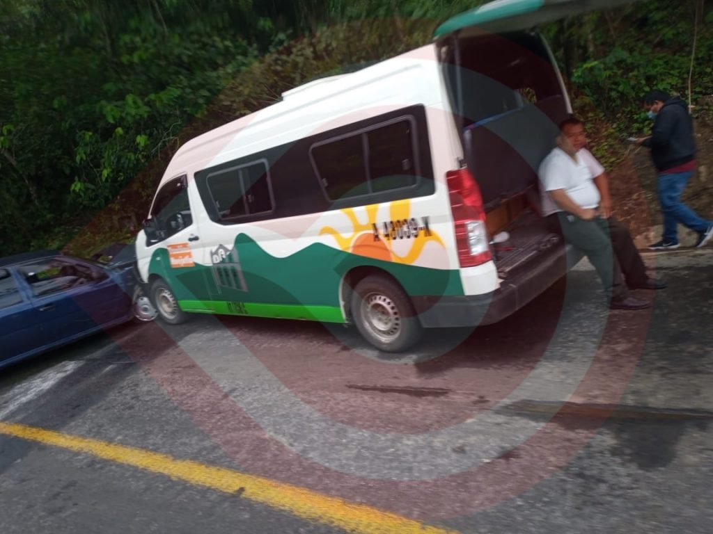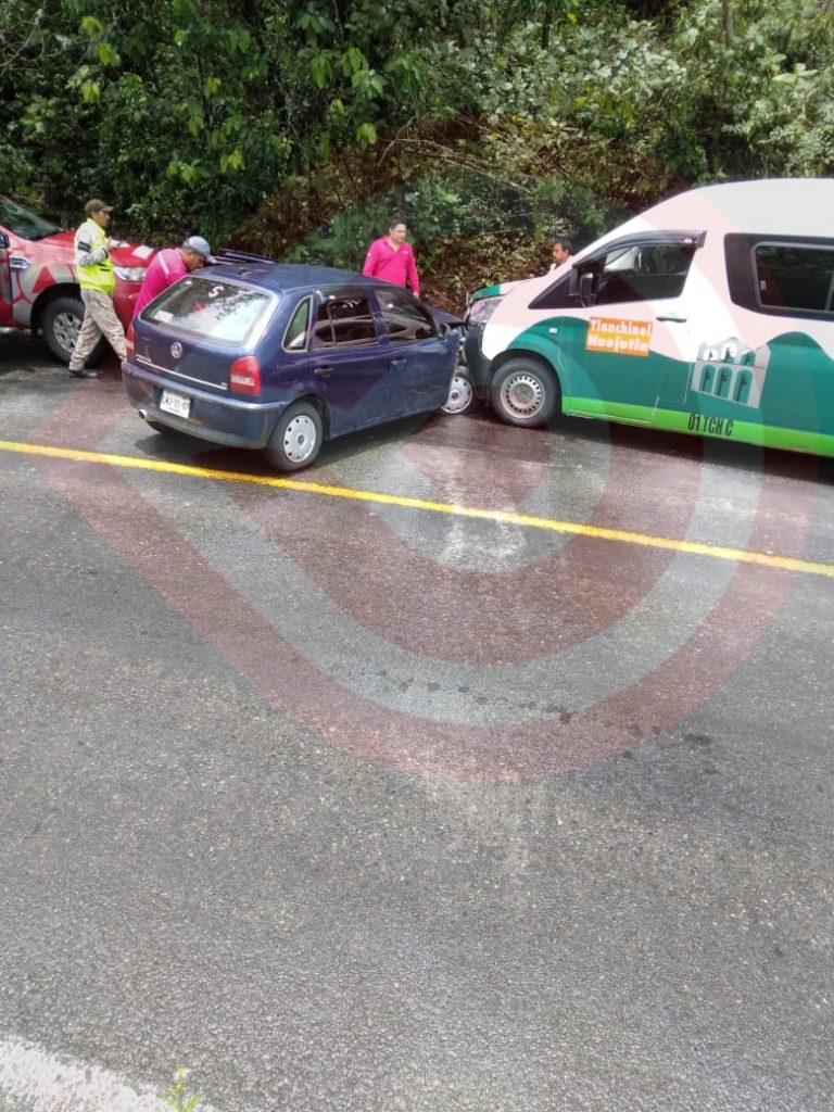 Tlanchinol, Hgo.-  Fuerte choque protagonizado por una unidad vehicular de transporte público perteneciente a la ruta Huejutla- Tlanchinol contra un vehículo particular de la marca Volkswagen sobre la Carretera México-Tampico a la altura de la entrada de la comunidad de Peyula en el balcón.