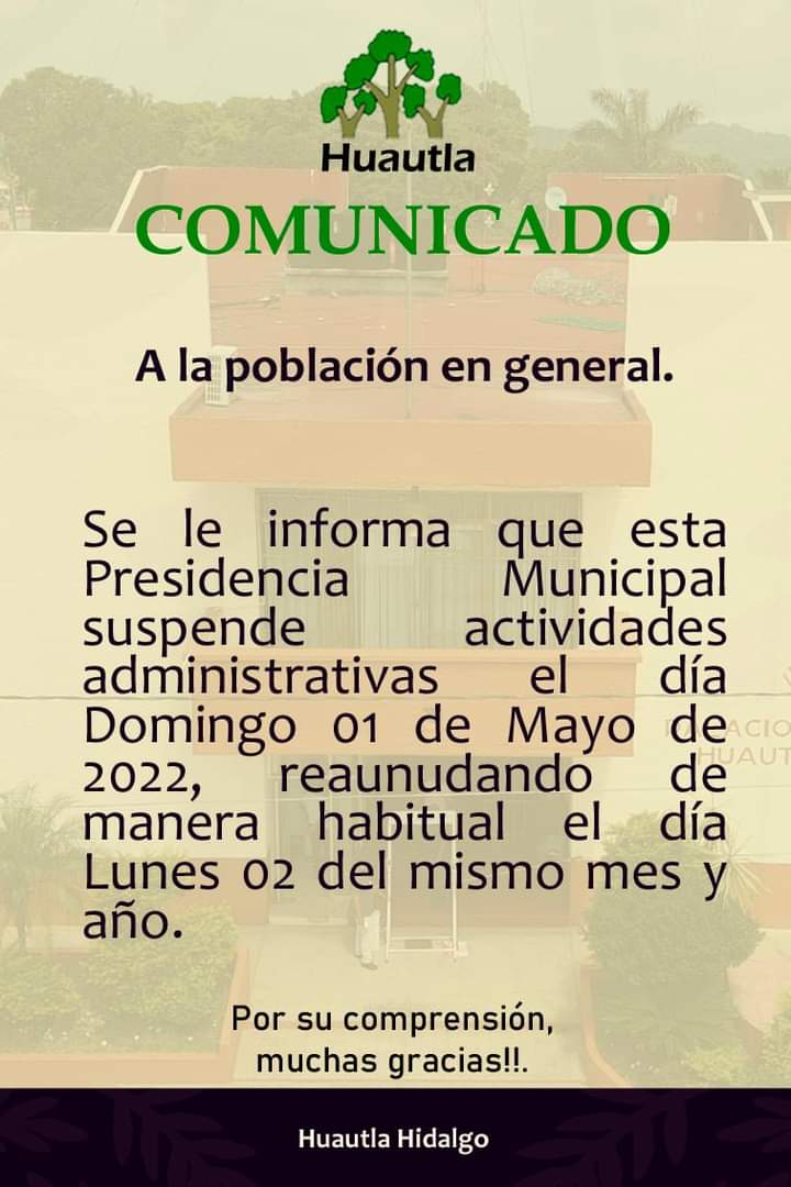 Por Redacción/Zunoticia Huautla, Hgo. – Por disposición de la ley Federal del trabajo, este domingo 01 de mayo habrán de suspenderse las actividades administrativas en las diferentes áreas del gobierno local. Así lo dieron a conocer fuentes oficiales a través de sus redes sociales y medios de comunicación, a efecto de que la ciudadanía está… Seguir leyendo Alcaldía suspende actividades