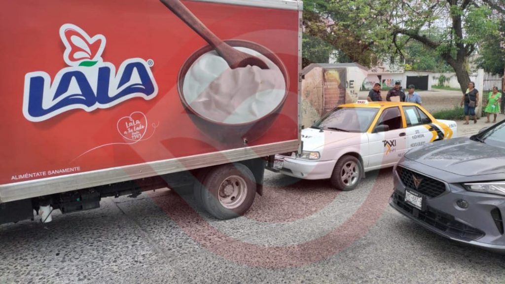 Huejutla, Hgo.- Aparatoso choque dejó como saldo daños materiales en la parte frontal de un vehículo del transporte público en modalidad de taxi, el cual se impactó contra un camión.