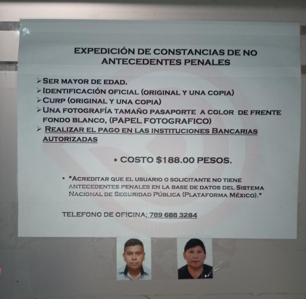 El solicitante deberá acreditar que no tiene antecedentes penales en la base de datos del Sistema Nacional de Seguridad Pública (Plataforma México); el horario de atención es de lunes a viernes, de 9:00 de la mañana a 3:00 de la tarde y para más información pueden llamar al número telefónico 789-688-3284.