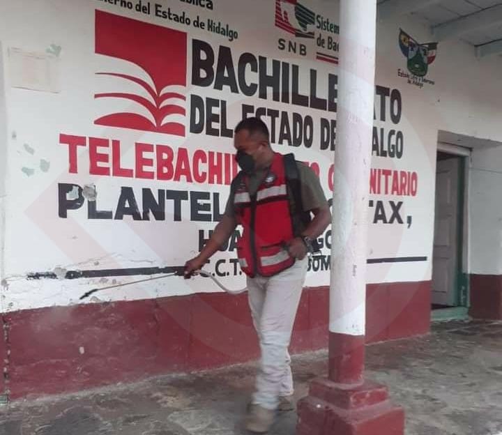 Huazalingo, Hgo. – Con el firme propósito de seguir previniendo contagios de Covid en las instituciones educativas de este municipio, el alcalde Julio César González, a través del área de Protección Civil local aplicó acciones de sanitización en las escuelas de Coamontax.