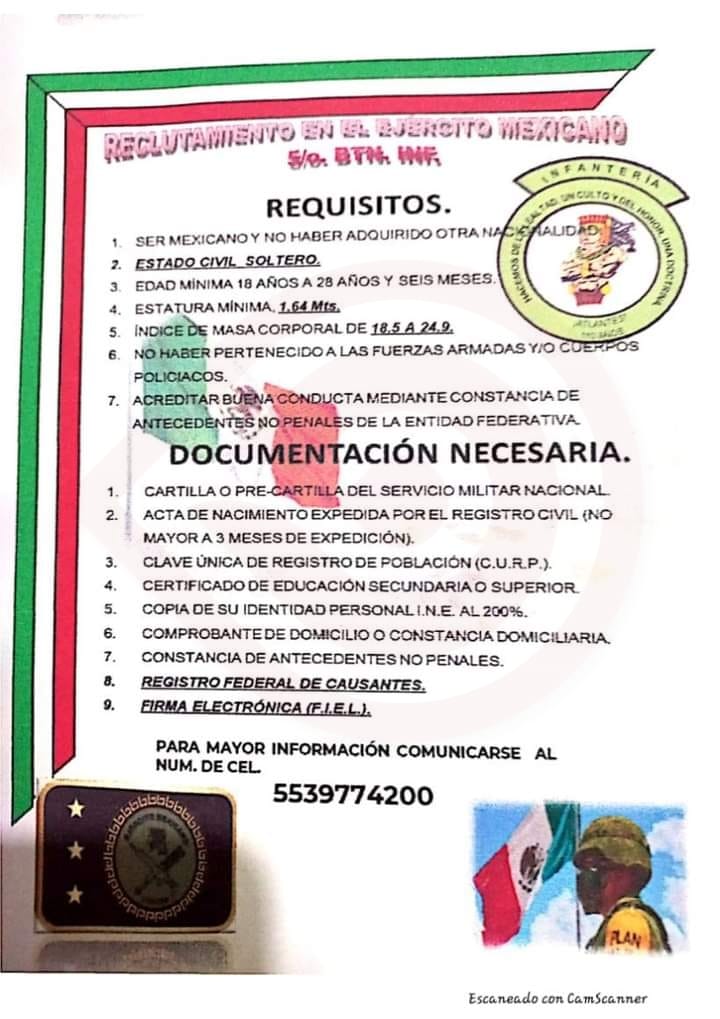 Huautla, Hgo. – La Junta municipal de reclutamiento del servicio militar nacional, difunde la invitación a los jóvenes huautlenses para ingresar a las fuerzas armadas, concretamente al 5to. Batallón de Infantería ubicado en Zimapan, Hgo.