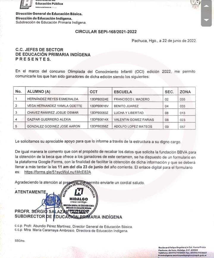 En el mismo contexto, Celso Hernández, expresó “hoy como sector educativo de nuestro nivel nos congratulamos al informarles que, de estos nueve alumnos participantes, salió seleccionada la niña Yamila Odette Vega Hernández, alumna de sexto grado de la Escuela Primaria “Benito Juárez”, de la localidad de Papatlatla, Calnali, dependiente de la Zona Escolar 033″.