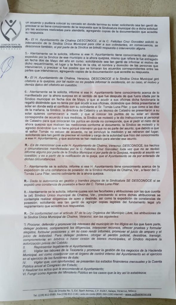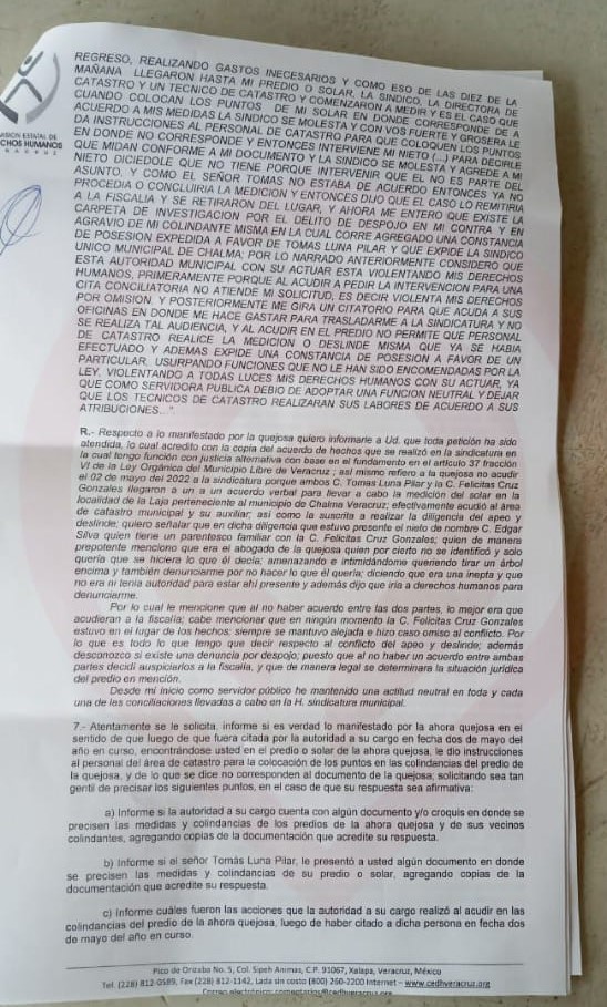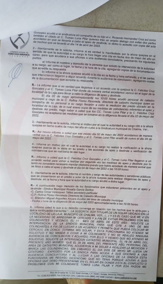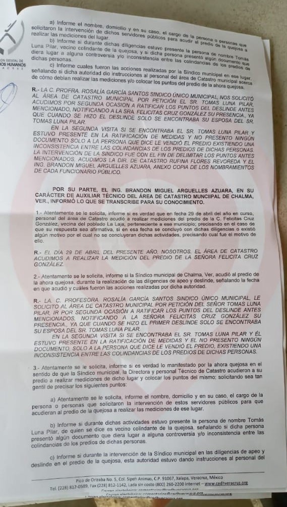 Así lo dio a conocer la afectada Felicitas Cruz Gonzales originaria de La Laja, Chalma, Veracruz quien comentó que el pasado 02 de mayo, aproximadamente las 10:00 horas acudió personal de Catastro Municipal a cago de Rufina Flores Revoreda, directora de Catastro Municipal, quien en compañía de su personal a su cargo llevaron a cabo la medición del predio ubicado en la localidad de la Laja, de lo cual mostró un documento con las medidas de colindancias referentes al apeo y deslinde del predio, sin embargo, el señor Tomás Luna Pilar y Felicitas Cruz Gonzáles no aceptaron las medidas que se tomaron en la diligencia llevada en esa fecha.