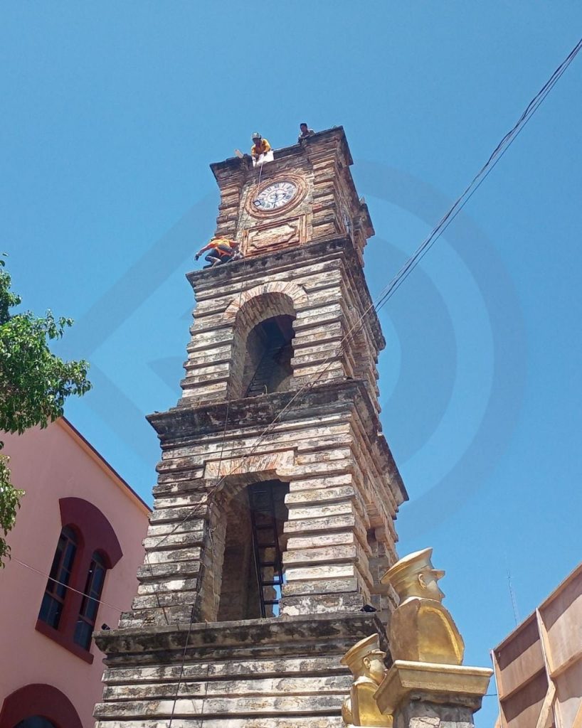 Huejutla, Hgo. – Elementos del Heroico Cuerpo de Bomberos en coordinación con trabajadores de las diferentes áreas de la presidencia municipal, retiraron la maleza que había crecido entre los ladrillos del Reloj Monumental de esta ciudad.