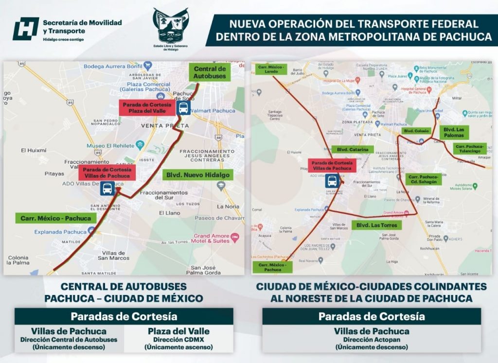Según los acuerdos firmados en una minuta de trabajo, los vehículos de transporte federal que tengan como destino u origen el ingreso a la central de autobuses de Pachuca ya no podrán llevar a cabo paradas de ascenso y descenso de forma indiscriminada en las vías de competencia estatal como el Boulevard Nuevo Hidalgo y sólo se les permitirá a dichas empresas una parada para solo ascenso de cortesía en la zona de Plaza del Valle en el Boulevard Nuevo Hidalgo cuando transiten con destino a la Ciudad de México y otra también de cortesía pero solo para descenso en la zona de Villas de Pachuca cuando vengan provenientes de la Ciudad de México.