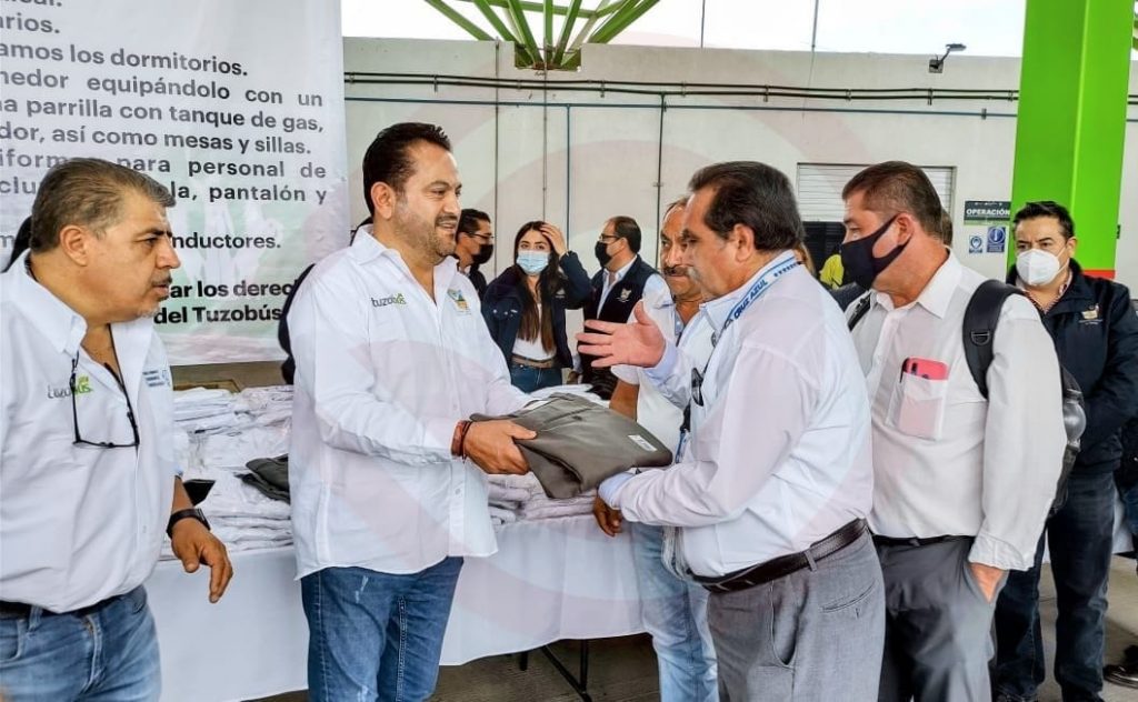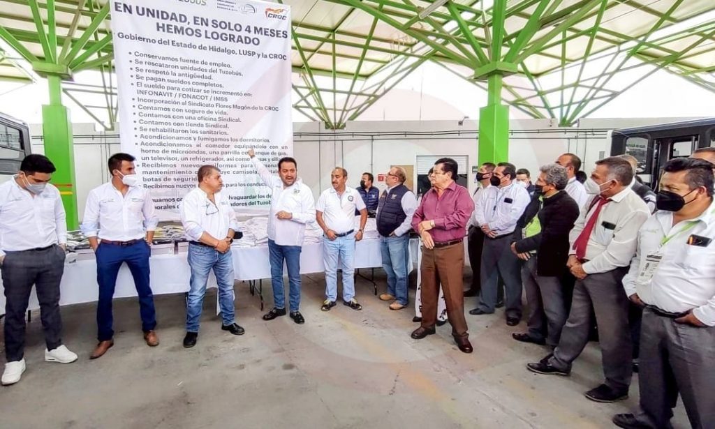 Acompañado de Oscar Monzalvo Destunis, presidente del Consejo de administración de LUSP, el titular de la dependencia mencionó que gracias a la coordinación entre Gobierno del Estado de Hidalgo – Líneas Urbanas y Suburbanas de Pachuca S.A. de C.V. y el Sindicato Flores Magón de la CROC, en solo 4 meses los trabajadores conservaron su fuente de empleo, se rescataron unidades del Tuzobús, se respetó la antigüedad laboral, se pagan sueldos completos, el sueldo se incrementó para cotizar más en: INFONAVIT / FONACOT / IMSS, se incorporaron al Sindicato Flores Magón de la CROC, cuentan con seguro de vida, cuentan con una oficina Sindical y tienda Sindical, se rehabilitaron los sanitarios, se acondicionaron y fumigaron los dormitorios, se acondiciono el comedor equipándolo con un horno de microondas, una parrilla con tanque de gas, un televisor, un refrigerador, así como mesas y sillas, recibieron nuevos uniformes para personal de mantenimiento que incluye camisola, pantalón y botas de seguridad, al igual que se entregaron nuevos uniformes para los conductores.