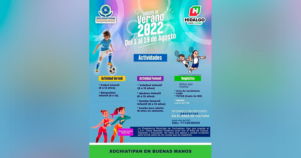 Por Redacción/Zunoticia Xochiatipan, Hgo.- El Ayuntamiento que preside Oscar Bautista Gutiérrez invita a la población general infantil a participar en los cursos de verano 2022, que se impartirán del 1 al 19 de agosto. De igual manera podrán participar adultos de 18 años en adelante en la actividad de zumba, a fin de generar mejores… Seguir leyendo Invita ayuntamiento a cursos de verano