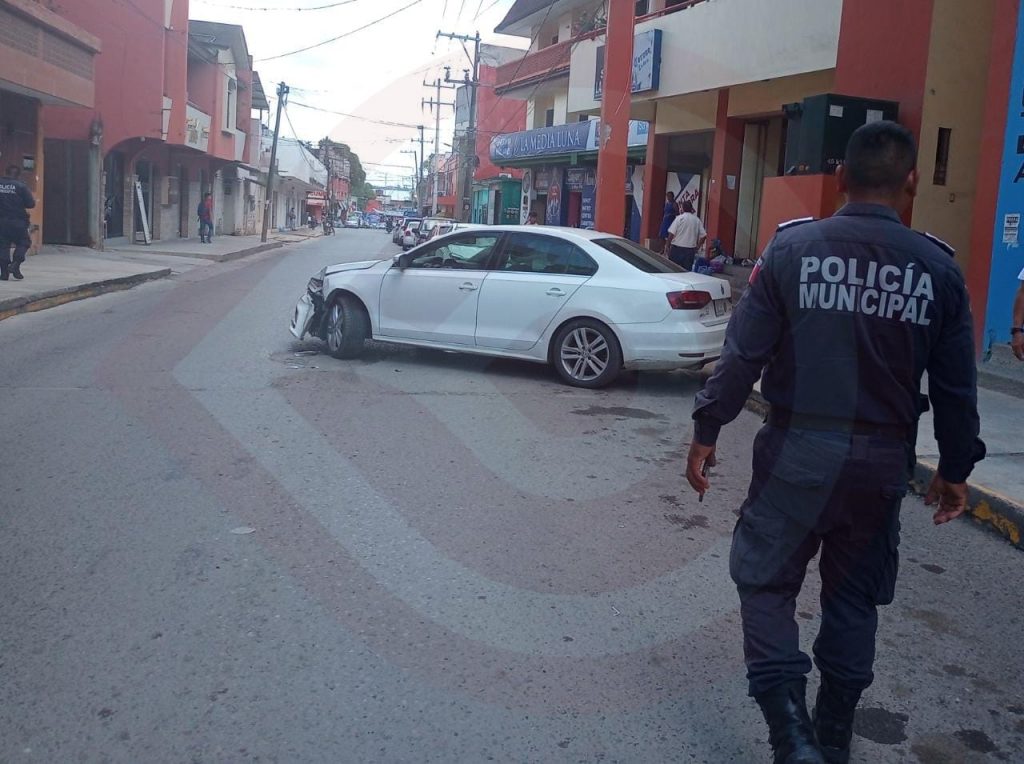 Huejutla, Hgo. – Un tráiler de exceso de dimensiones que circulaba en la calle Toribio Reyes, de la colonia Juárez de esta ciudad, chocó y destrozó la parte frontal de un auto compacto.