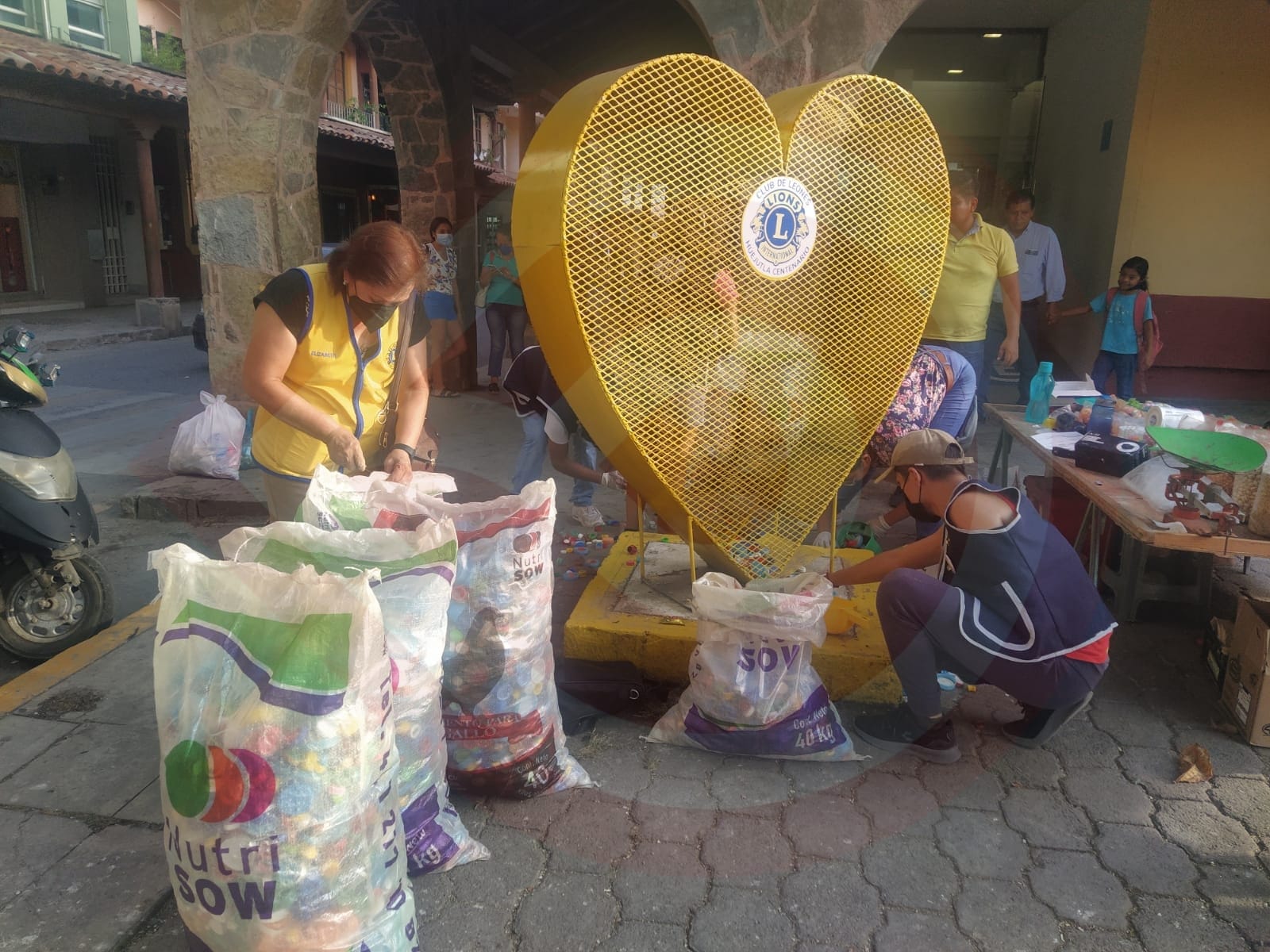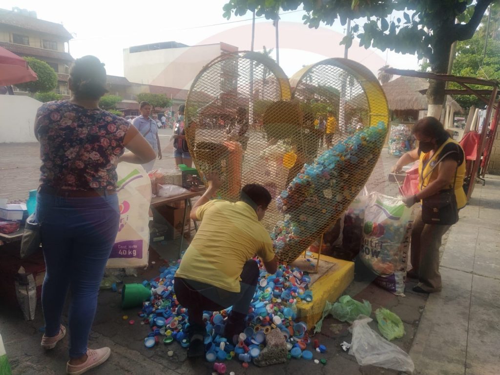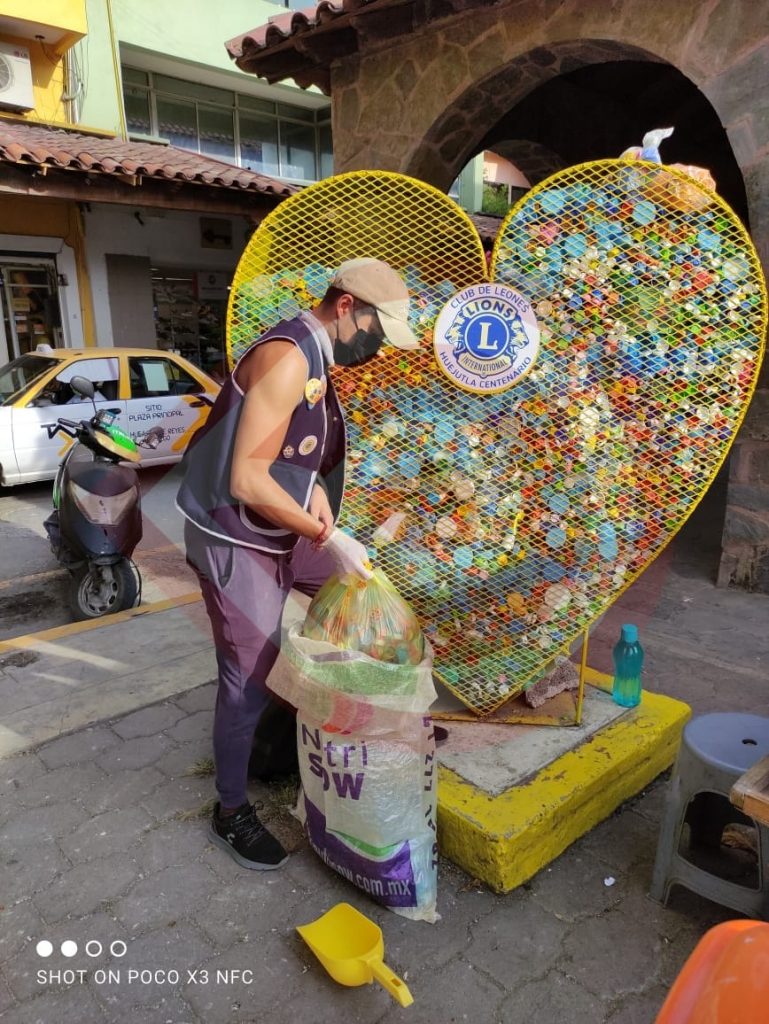 Huejutla, Hgo. – Un promedio de 7 arpillas de tapitas fueron recogidas por parte de los integrantes del Club LEO Huejutla, del Corazón contenedor amarillo, ubicado en la plaza 21 de Mayo, en esta ciudad de Huejutla de Reyes.