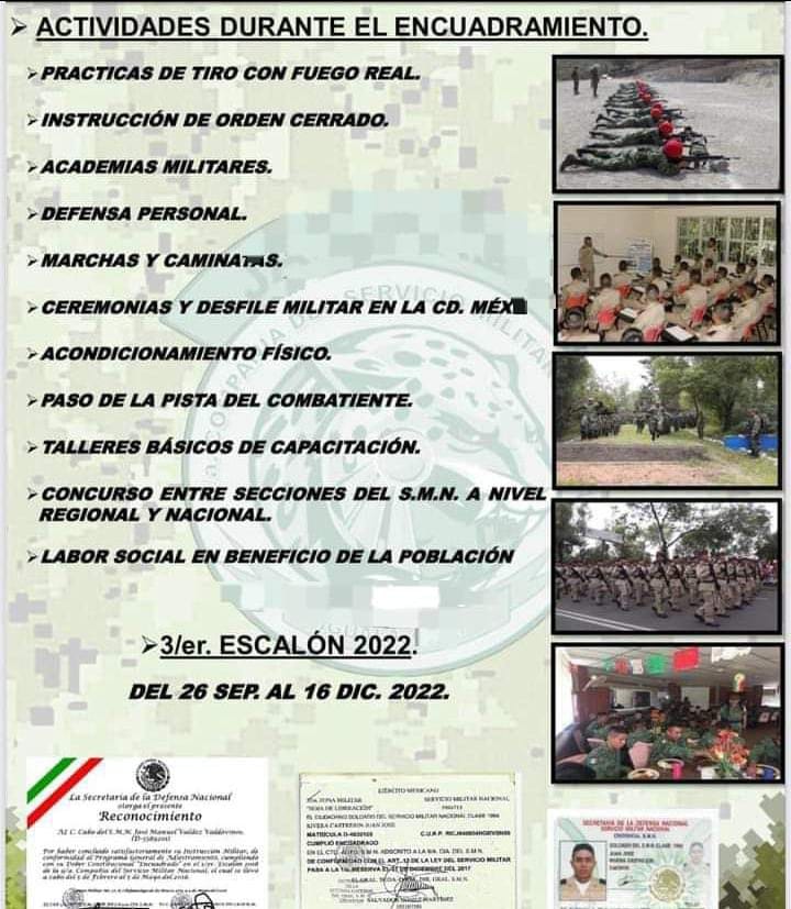 De acuerdo con la convocatoria, la documentación para los jóvenes es la cartilla de identidad del Servicio Militar Nacional en buen estado, credencial de elector, CURP, acta de nacimiento, constancia de estudios, comprobante de domicilio, carta de antecedentes no penales y constancia de vacunación de covid-19.