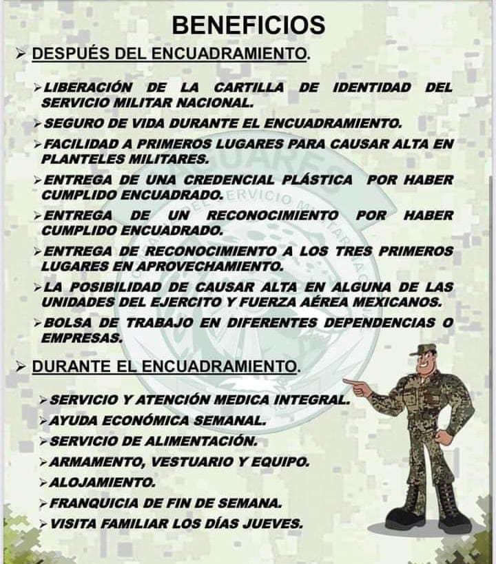 Después del encuadramiento, obtendrán la liberación de la cartilla de identidad del Servicio Militar Nacional, seguro de vida durante el encuadramiento, facilidad a primeros lugares para causar alta en planteles militares, entrega de una credencial plástica por haber cumplido encuadrado, entrega de un reconocimiento por haber cumplido, la posibilidad de causar alta en alguna de las unidades del ejército y fuerza aérea mexicanos.