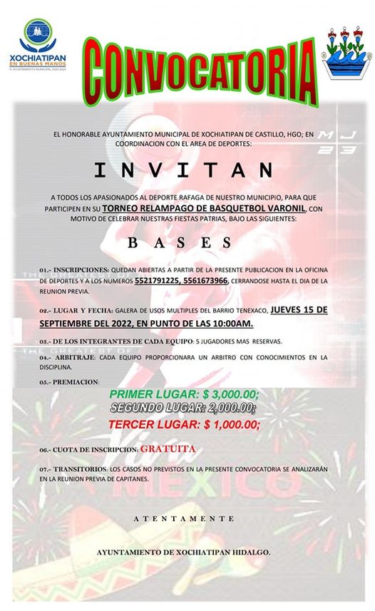 Por Redacción/Zunoticia Xochiatipan, Hgo. – El gobierno municipal que encabeza Oscar Bautista Gutiérrez, a través del área de Deportes, invita a los equipos de básquetbol del municipio a participar en el “Torneo Relámpago Varonil”. Dicho evento se llevará a cabo este 15 de septiembre, a partir de las 10:00 horas, en la galera de usos… Seguir leyendo Convoca ayuntamiento al torneo deportivo