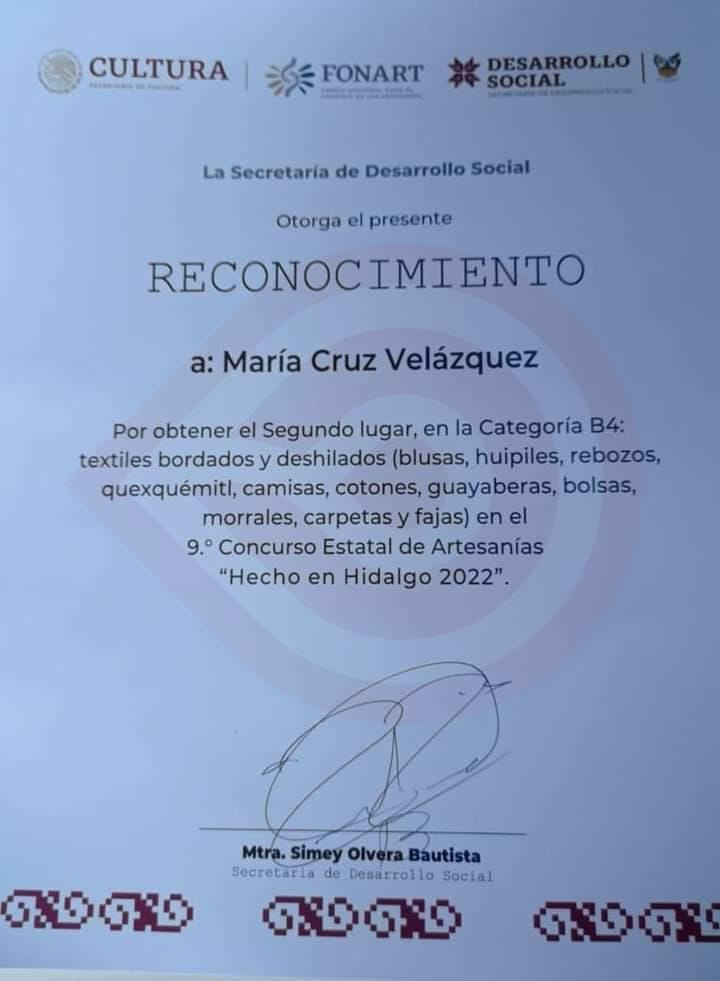 Se trata de la señora María Cruz Velazco, originaria de la comunidad de Tepetitla, quien representó a este municipio obteniendo el segundo lugar con la presentación de una blusa de manta, en bordado de pepenado corrugado, ante la Secretaría de Desarrollo Social (SEDESO) y el Fondo Nacional para el Fomento de las Artesanías (FONART), dependencias anfitrionas de este concurso.