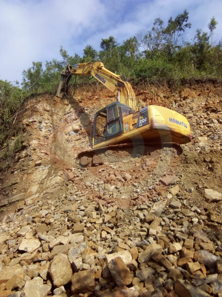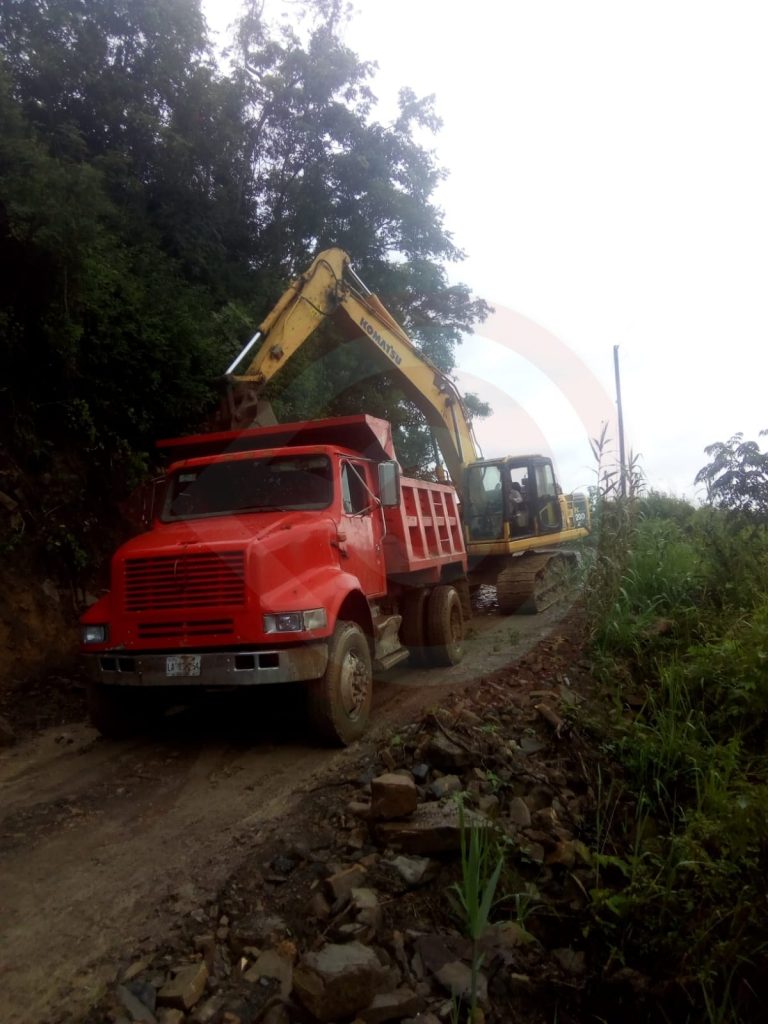 Trabajadores del área de maquinaria ejecutan labores para ampliar el camino Acanoa – Zapote – Xilico con el propósito de ampliar el espacio para una mejor circulación de unidades automotrices de distintas dimensiones.