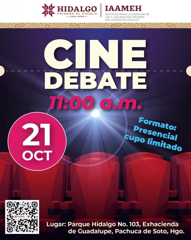 Por ello el IAAMEH invita a la siguiente función de este viernes 21 de octubre a las 11:00 horas en las oficinas centrales de este organismo, ubicadas en Parque Hidalgo #103, Col. Ex hacienda de Guadalupe, Pachuca de Soto, Hidalgo, donde se proyectará una película con temática relacionada al envejecimiento y las situaciones que las personas mayores pueden llegar a vivir, generando con ello un intercambio de comentarios y experiencias entre las y los asistentes.