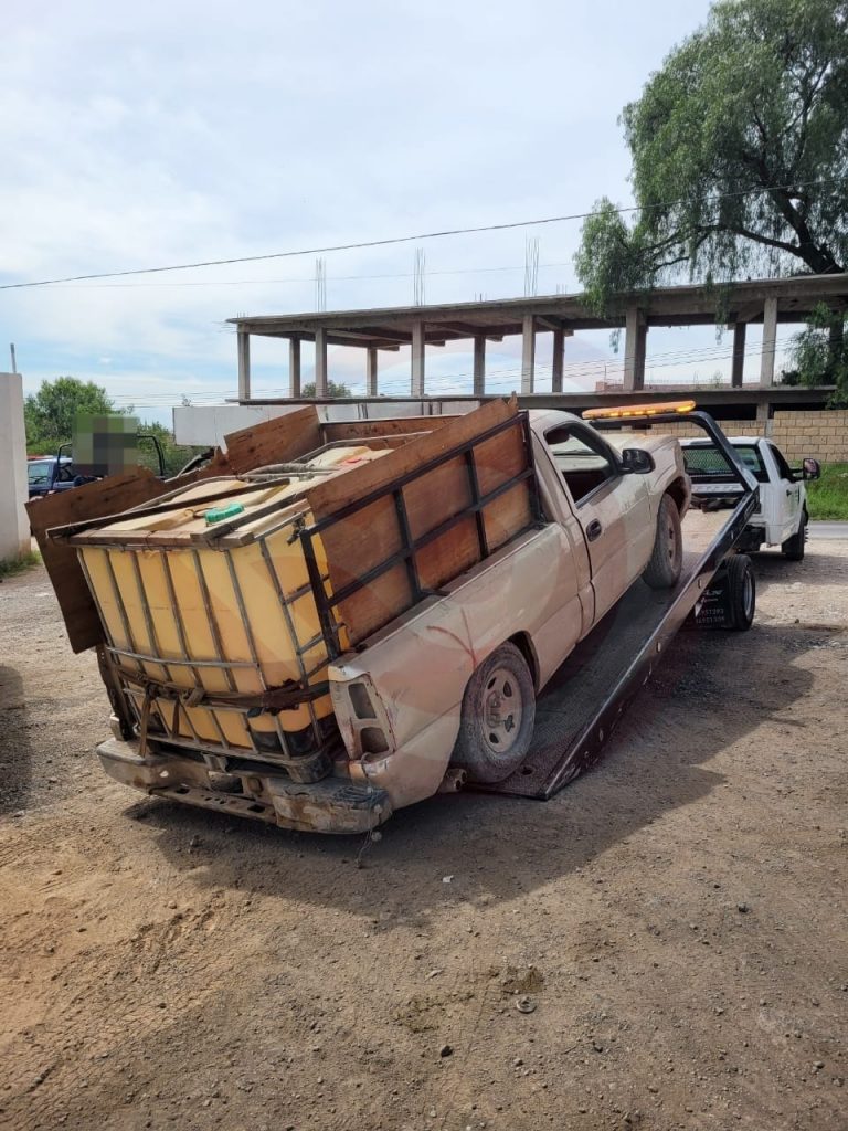 En el municipio de Chapantongo, sobre la carretera Nopala-Tlaunilolpan, fue decomisada una camioneta Ford F-350, con reporte de robo en el Estado de México, cargada con 4 recipientes para mil litros (uno con hidrocarburo en su interior).