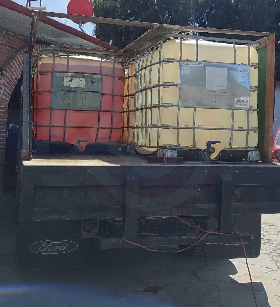 Finalmente, en la carretera Pachuca-Ciudad Sahagún, a la altura del municipio de Tlanalapa, fueron aseguradas, tras persecuciones: una camioneta Chevrolet de tres y media toneladas, cargada con 4 contenedores con capacidad para mil litros cada uno, un tambo de 200 litros y 4 garrafones para 50 litros; y una camioneta Ford Econoline cargada con 3 bidones para mil litros, y 3 contenedores para 10, 50 y 20 litros, respectivamente.