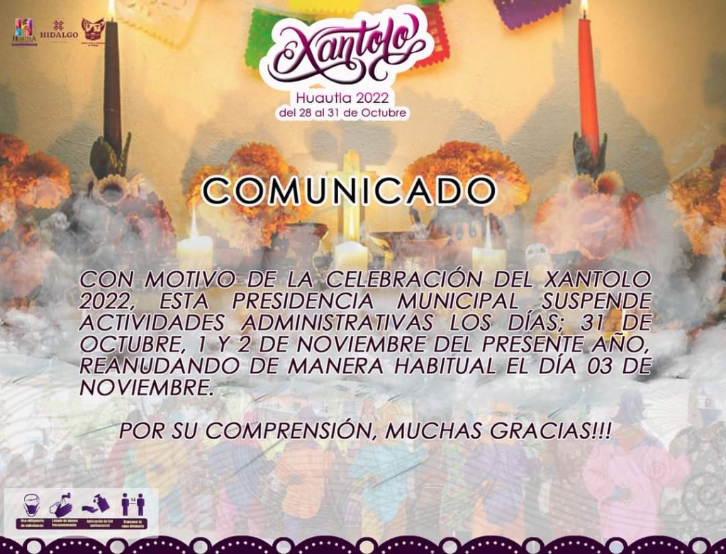 Huautla, Hgo. – Desde este lunes y hasta el miércoles 02 de noviembre, las oficinas de la presidencia municipal estarán cerradas al público, lo que se informa a la ciudadanía con el propósito de evitar molestias, y a la vez, pedir su comprensión.