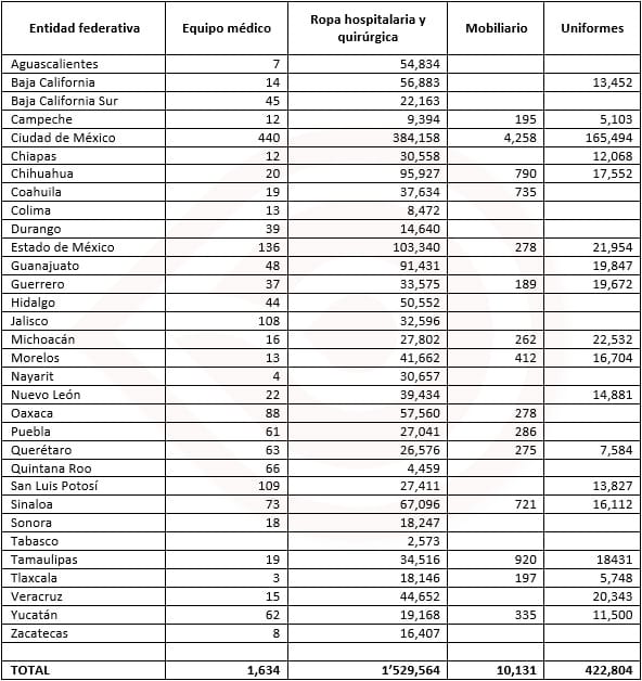 De ropa hospitalaria y quirúrgica se compraron dos millones 278 mil 972 piezas por un monto de 483 millones 573 mil 79 pesos. A la fecha, se han entregado un millón 529 mil 564 unidades. El objetivo es garantizar la adecuada atención a pacientes y la debida protección del personal médico y de enfermería.