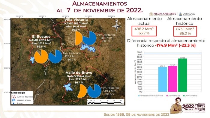 El Organismo de Cuenca Aguas del Valle de México, de Conagua, dio a conocer que el almacenamiento de los embalses del Sistema Cutzamala (El Bosque, Valle de Bravo y Villa Victoria), que abastecen a una parte de la Zona Metropolitana del Valle de México, en total, se ubica en 63.7% de su nivel de llenado, lo que representa 0.1% menos que lo informado el 1 de noviembre pasado y 22.3% menos que el nivel histórico a esta fecha.