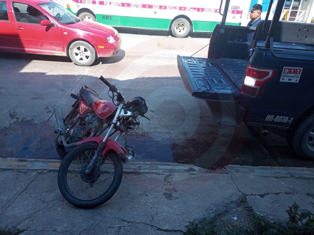 Huejutla, Hgo. – Un choque entre una motocicleta y una camioneta de la Comisión Federal de Electricidad (CFE), dejó como saldo a un estudiante del CECyTEH lesionado y daños materiales considerables.