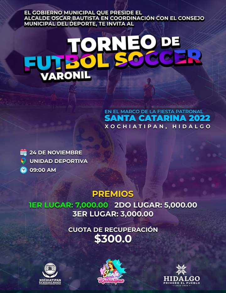 Xochiatipan, Hgo. – En el marco de la celebración de la fiesta patronal de Santa Catarina Mártir, el gobierno municipal de este lugar, a cargo del alcalde Óscar Bautista Gutiérrez, invita a la población en general a participar en los torneos deportivos a desarrollarse en diferentes sedes del municipio.