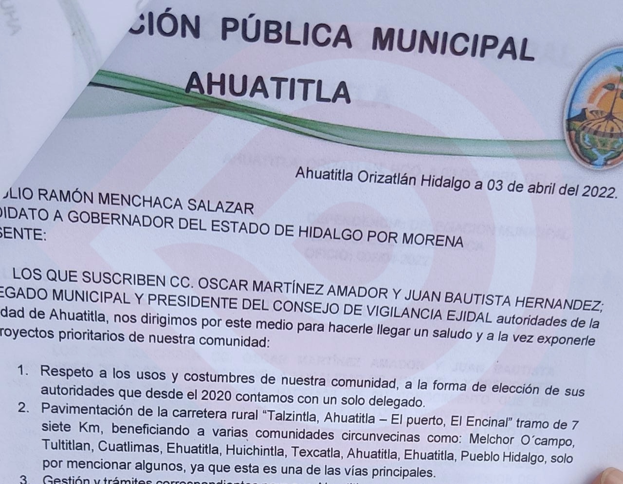 Por Ángel Silverio/Zunoticia San Felipe Orizatlán, Hgo.- Autoridades de la delegación de Ahuatitla hicieron una solicitud al gobernador del estado Julio Menchaca Salazar, para que les apoye y considere dentro de su Plan de Desarrollo Estatal la pavimentación de un tramo carretero con el cual se verán beneficiadas varias localidades. En entrevista con las autoridades… Seguir leyendo Piden al gobernador pavimentación de carretera
