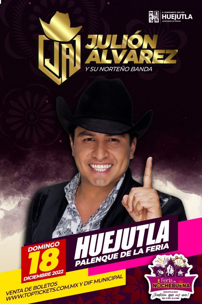Huejutla, Hgo.- Daniel Andrade Zurutuza, presidente municipal de Huejutla, en conferencia de prensa realizada en la Sala de Cabildos del Ayuntamiento de Huejutla, confirmó y oficializó la presentación del llamado “Rey de las taquillas” Julión Álvarez, el próximo domingo 18 de diciembre, en el Palenque de la tradicional Feria de Nochebuena 2022.