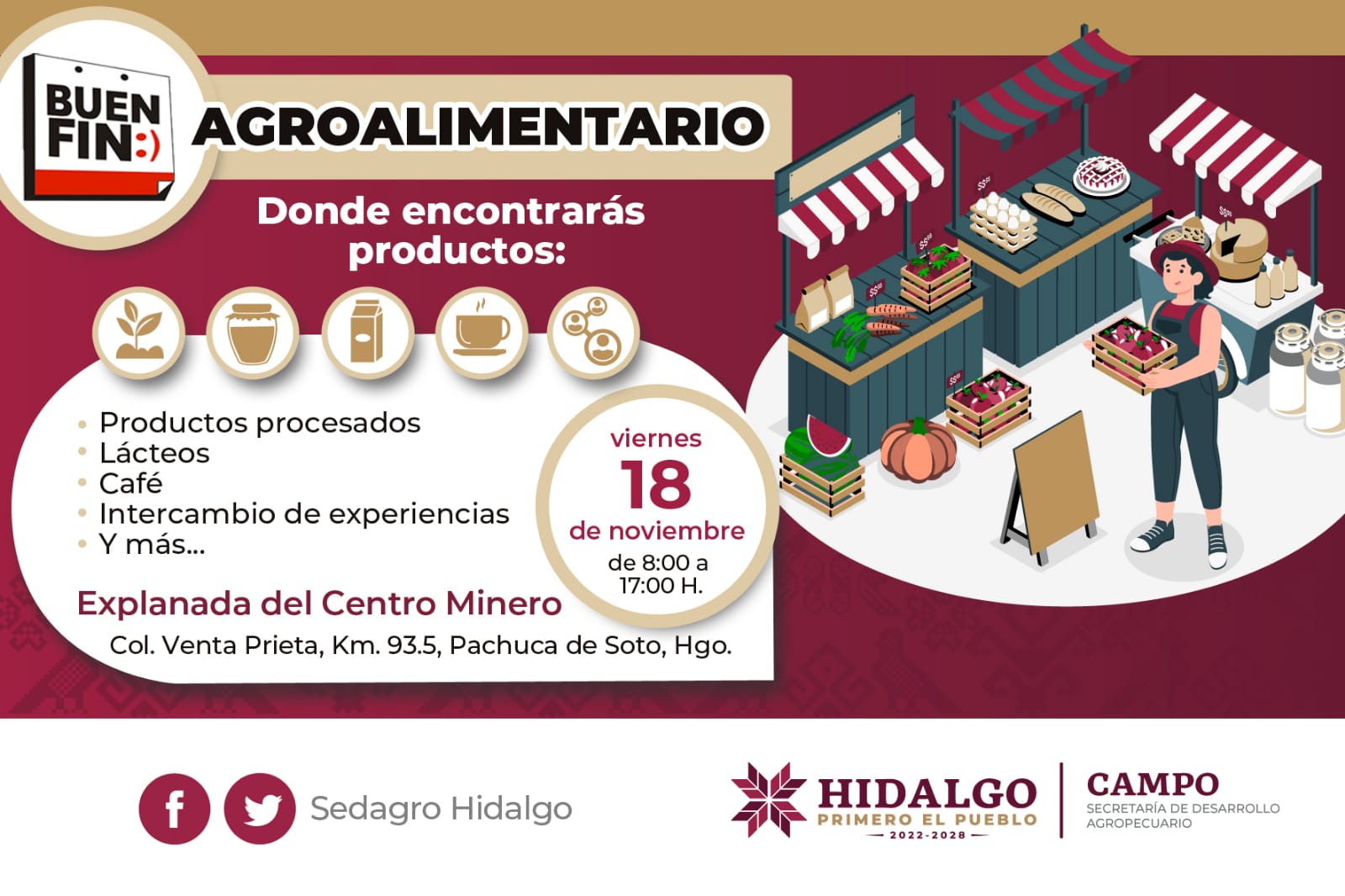Pachuca de Soto, Hgo. – Con el objetivo de promover e incentivar la comercialización y el consumo de los productos elaborados por manos hidalguenses, la Secretaría de Desarrollo Agropecuario de Hidalgo (SEDAGROH) organiza este 18 de noviembre el “Buen fin agroalimentario” en la explanada del Centro Minero, colonia Venta Prieta Km. 93.5, Pachuca de Soto.