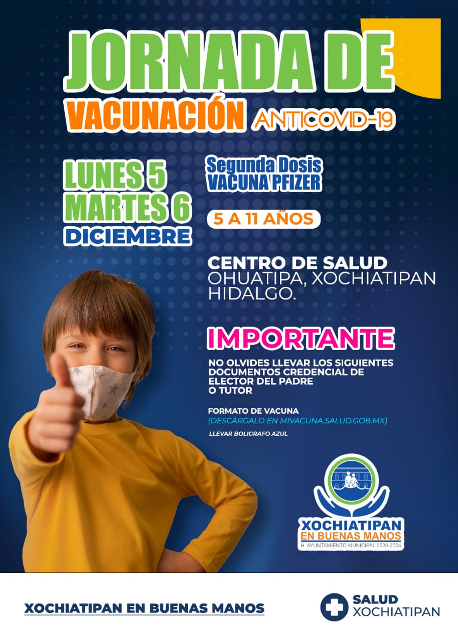Por Redacción/Zunoticia Xochiatipan, Hgo. – El gobierno municipal que preside Óscar Bautista Gutiérrez, a través del área de Salud Municipal y en coordinación con la Secretaría de Salud del Estado de Hidalgo, informan que los días 5 y 6 del mes en curso habrá vacunación contra COVID-19 a niños de 5 a 11 años de… Seguir leyendo Vacunarán a niños de 5 a 11 años de edad