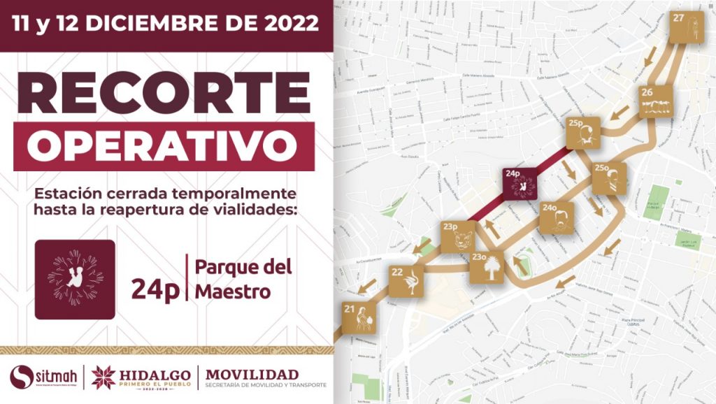 Pachuca, Hgo.- La Secretaría de Movilidad y Transporte, (SEMOT), a través del Sistema Integrado de Transporte Masivo de Hidalgo (SITMAH) informan que, debido a las actividades relacionadas con los festejos conmemorativos a la virgen de Guadalupe, que mantendrán cerrada una parte de la Avenida Juárez, este domingo 11 y lunes 12 de diciembre, el servicio de transporte público Tuzobús, hará un recorte operativo que implica que la estación del Parque del Maestro, se mantendrá cerrada temporalmente hasta la reapertura de vialidades.