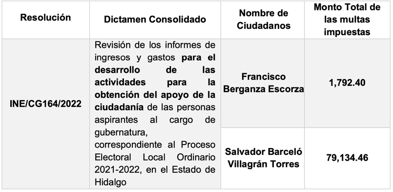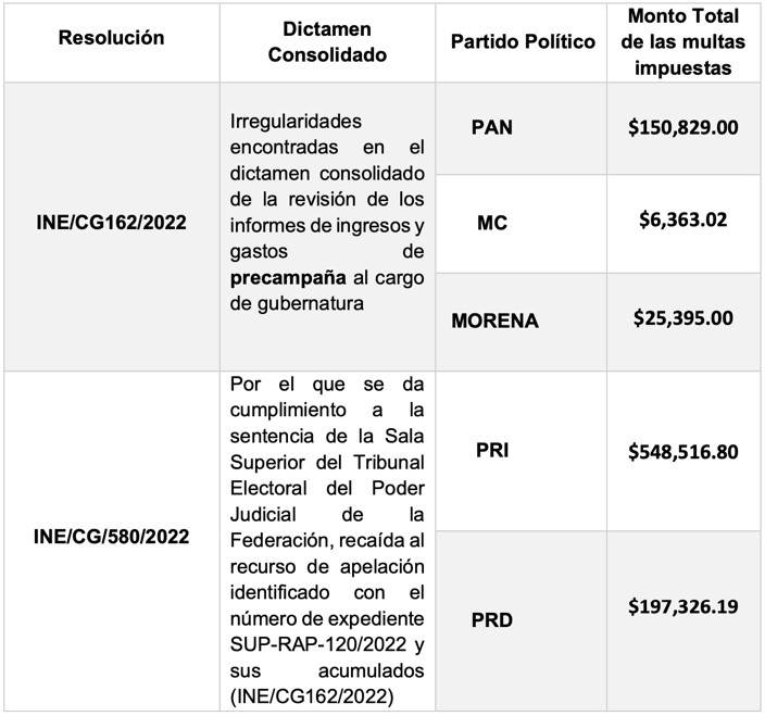 Respecto del Dictámen Consolidado relativo a los ingresos y gastos de precampaña del Proceso Electoral Local Ordinario 2021- 2022, así como del correspondiente al desarrollo de las actividades para la obtención del apoyo ciudadano de las personas aspirantes a participar bajo la modalidad de candidatura independiente en el mismo Proceso, se dio cuenta de que derivado de las Resoluciones INE/CG162/2022, INE/CG164/2022 e INE/CG/580/2022 y con motivo de la fiscalización de las actividades, el monto total de las multas impuestas se dio de la siguiente manera: