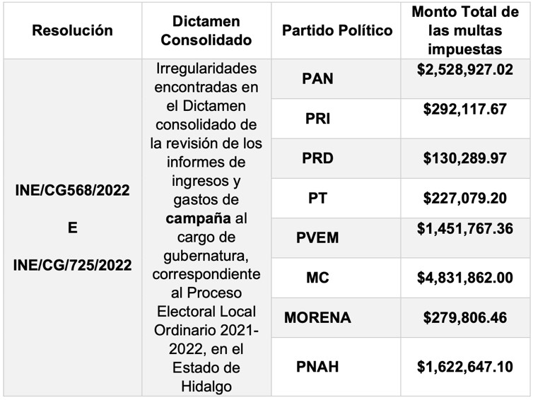 En lo que hace a los Dictámenes Consolidados correspondientes a los ingresos y gastos de campaña del mencionado Proceso Electoral, igualmente se informó que derivado de las Resoluciones INE/CG/568/2022 e INE/CG/725/2022, las multas impuestas fueron las siguientes: