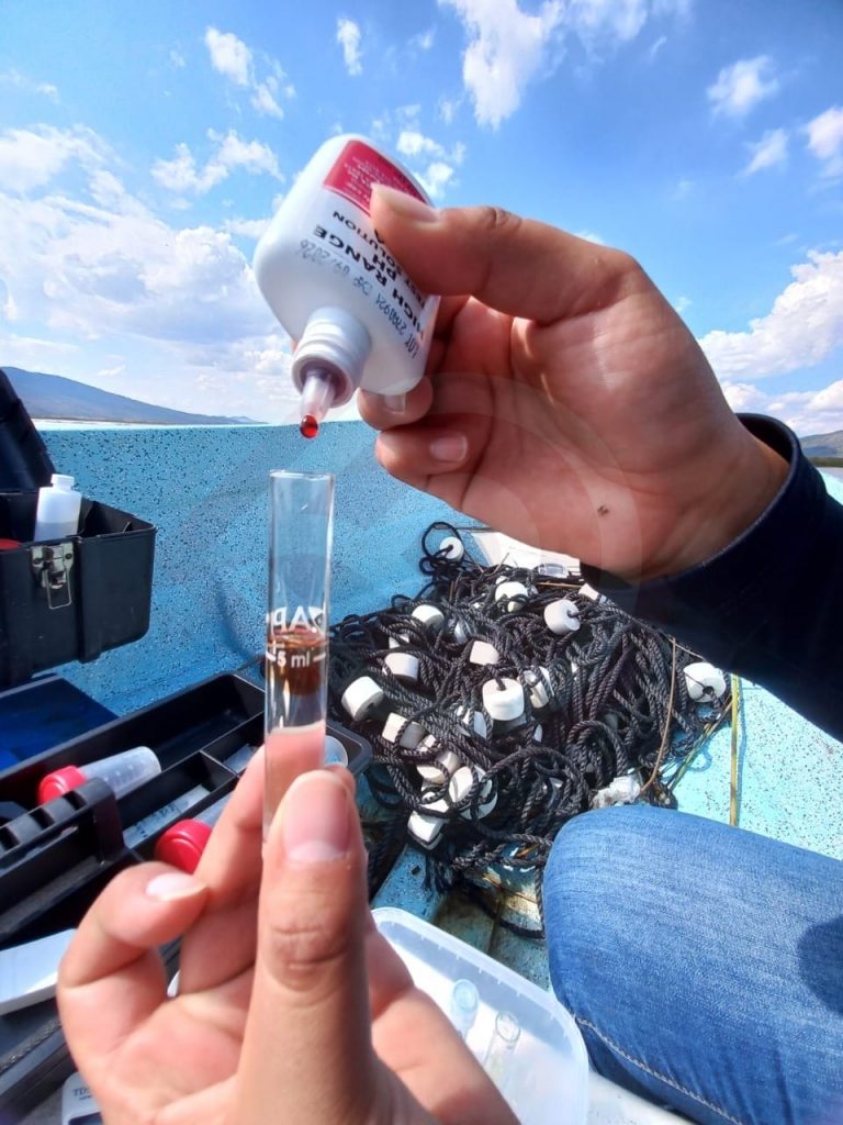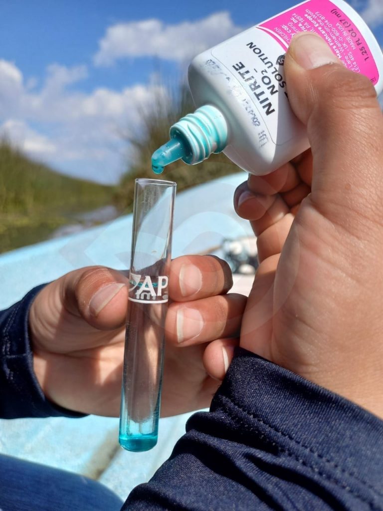 En ese sentido, en coordinación con la presidencia municipal de Apan, son tomadas muestras de la calidad del agua para evaluar parámetros de pH, pH de rango alto, amoniaco, nitritos, nitratos, temperatura y sólidos totales disueltos, todo ello por medio de un kit químico basado en el método de colorimetría.