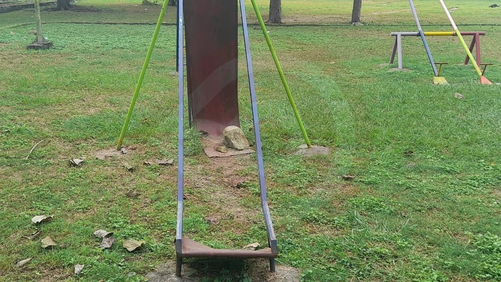 Detallaron que la lámina de la resbaladilla está completamente vencida y fuera de su marco, a tal grado, que la han replegado hasta la escalinata deteniéndola con una piedra; al sube y baja le falta uno de los asientos; y a uno de los columpios también se le ha desprendido un asiento que yace tirado a un lado.