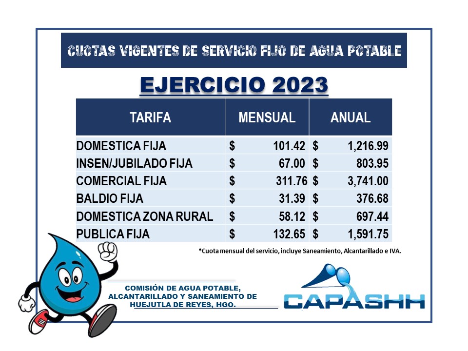 Especificó que para el ejercicio fiscal 2023 la tarifa doméstica fija mensual es de $101.42 pesos y anual $1,216.99 pesos; INSEN/jubilados fija $67.00 pesos y anual $803.95 pesos; comercial fija $311.76 pesos y anual $3,741.00; baldío fija $31.39 pesos y anual $376.68pesos; doméstica zona rural fija $58.12 y anual $697.44; pública fija $132.65 y anual $1,591.75 pesos.