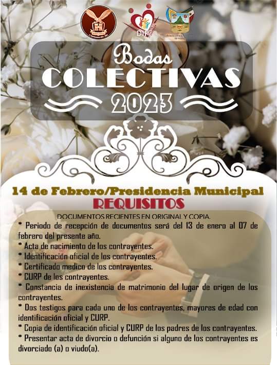 Huautla, Hgo. – El Sistema Municipal DIF que preside la señora Domitila de la Cruz Martínez, en coordinación con la oficina del Registro civil local, invita a las parejas solteras o que vivan en unión libre a inscribirse y contraer matrimonio en la boda colectiva a realizarse el próximo 14 de febrero.