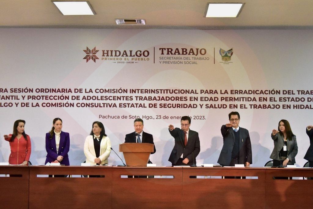 Pachuca, Hgo.- El gobernador Julio Menchaca Salazar tomó protesta a las y los integrantes de la Comisión Interinstitucional para la Erradicación del Trabajo Infantil y Protección de Adolescentes, Trabajadores en Edad Permitida en el Estado de Hidalgo (CIETIPATEP), al tiempo en que encabezó la instalación de la Comisión Consultiva Estatal de Seguridad y Salud en el Trabajo en Hidalgo (Cocoesst).
