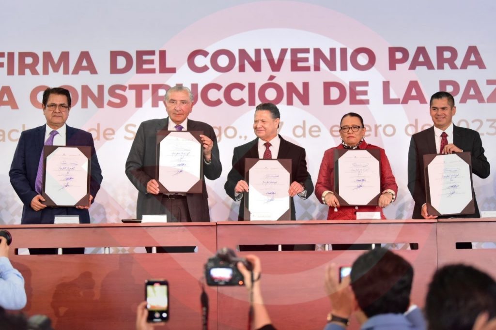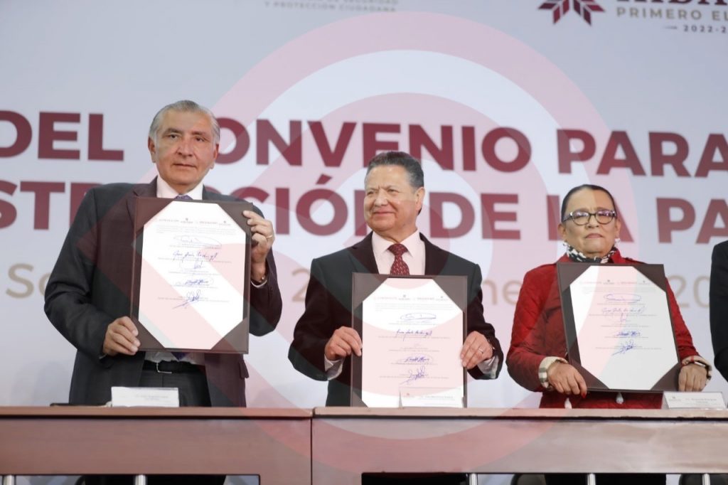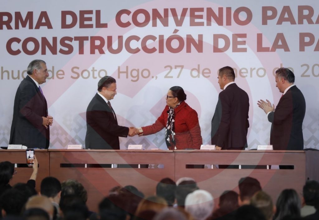Pachuca, Hgo.- Derivado de las problemáticas que durante años han aquejado al estado de Hidalgo, el gobernador Julio Menchaca Salazar, en compañía del secretario de Gobernación, Adán Augusto López Hernández, y de la titular de la Secretaría de Seguridad y Protección Ciudadana, Rosa Icela Rodríguez Velázquez, firmaron el Convenio para la Construcción de la Paz, lo cual permitirá afianzar los lazos de cooperación en beneficio del pueblo hidalguense.