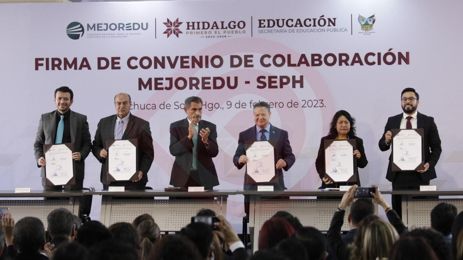 Este acuerdo, dijo, “nos va a permitir aprovechar la experiencia del gobierno federal en la mejora continua de la educación, por eso estamos involucrados todas y todos los integrantes del Gobierno de Hidalgo, para beneficiarnos de estos instrumentos de actualización”.